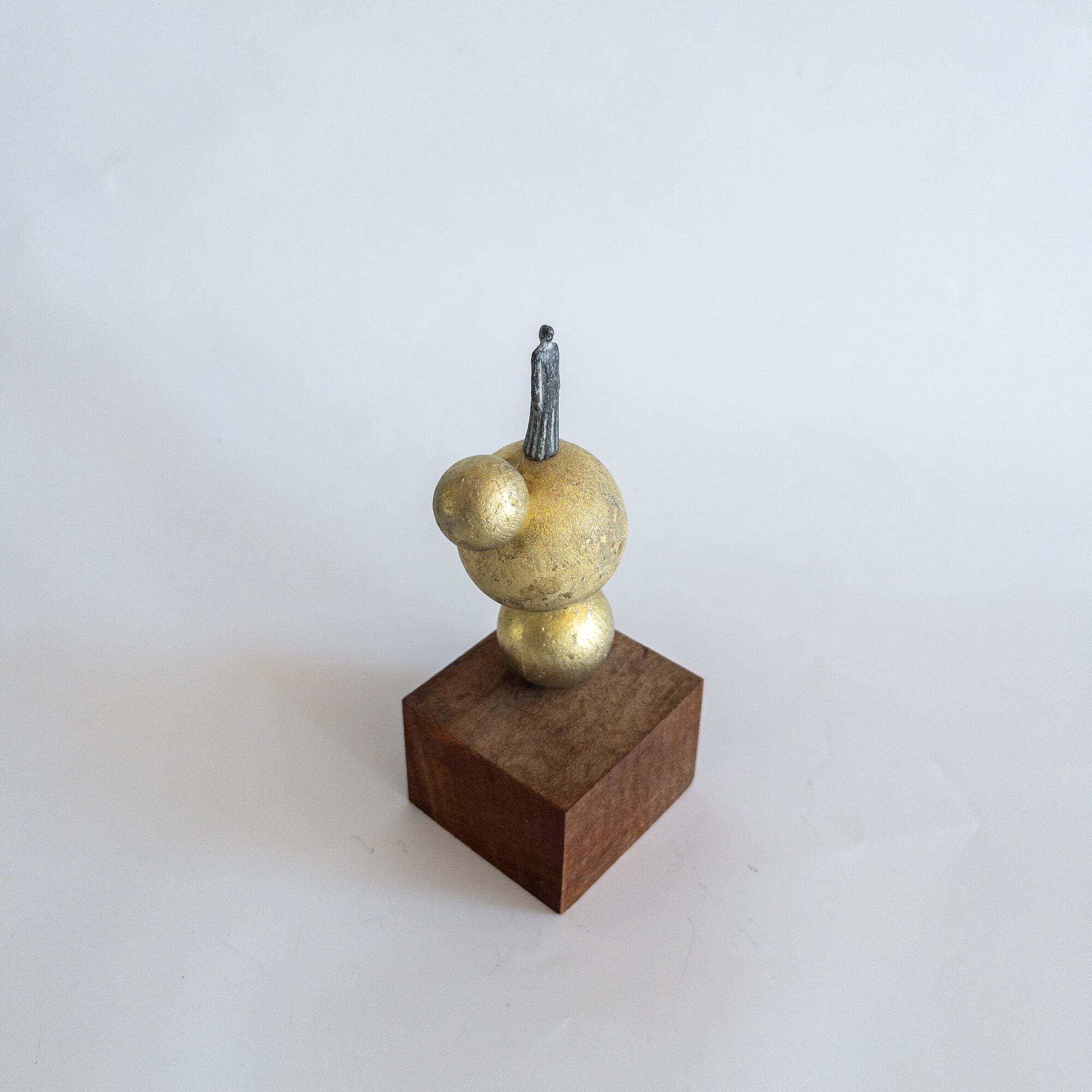 olectronicaの小さなピューターのシリーズです。ピューターの大きさの異なる3つの球体とフィギュアを組み合わせ風景を作っています。 オブジェは木製の台に固定されています。 サイズ:h138mm(人形30mm)木の台 54×56mm 材質:ピューター、木